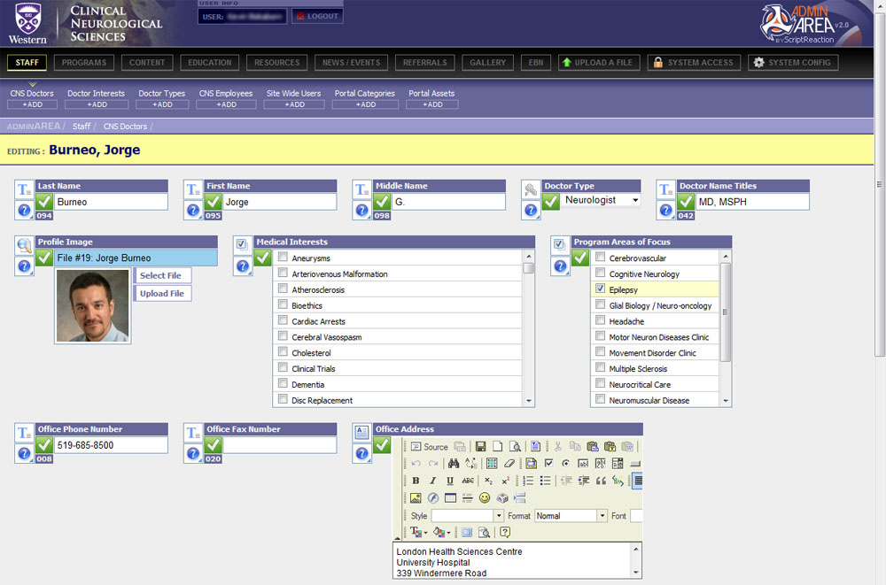 All content on the site was easily maintained by the doctors and their secretaries using "Admin Area", a custom content management system (CMS) I programmed. Admin Area was quickly adapted to the changing requirements of the department and rapidly advanced to handle the expanding collection of tools and content on the site.