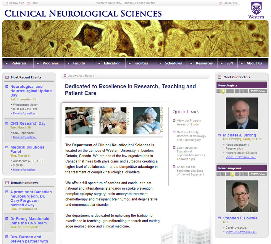 The site was an informational hub for patients, physicians, and hospital staff at University Hospital in London, Ontario. The site featured emergency referral instructions, department events, on-call and round schedules, and the latest news articles.