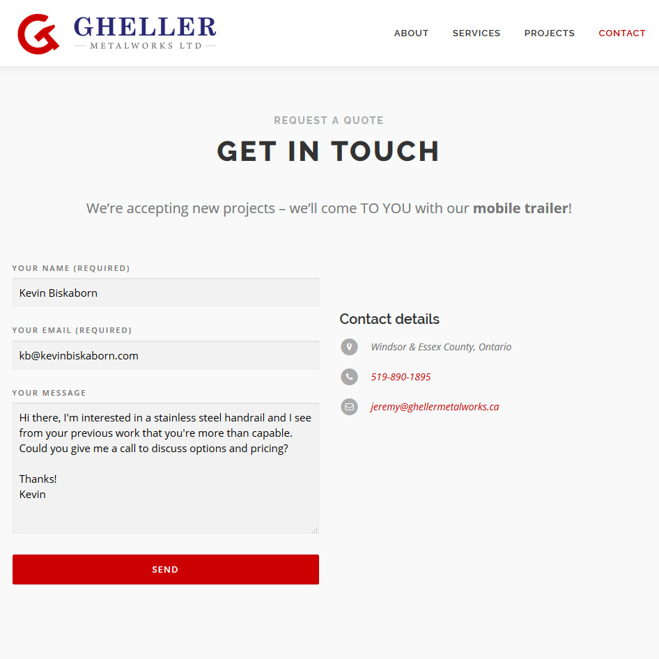Allowing customers to connect with you quickly and easily is always appreciated. An integrated contact form is essential to achieve that. Once filled out by potential customers, their messages are automatically e-mailed to the right destination. Gheller Metalworks uses this form to establish first contact with customers surfing the web.