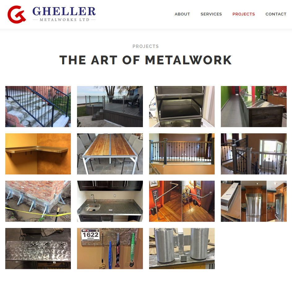 Projects completed by Gheller Metalworks are organized into a cleanly presented grid. Site viewers can interact with each project enlarging to the full screen size. This interaction works on both mobile and desktop devices.