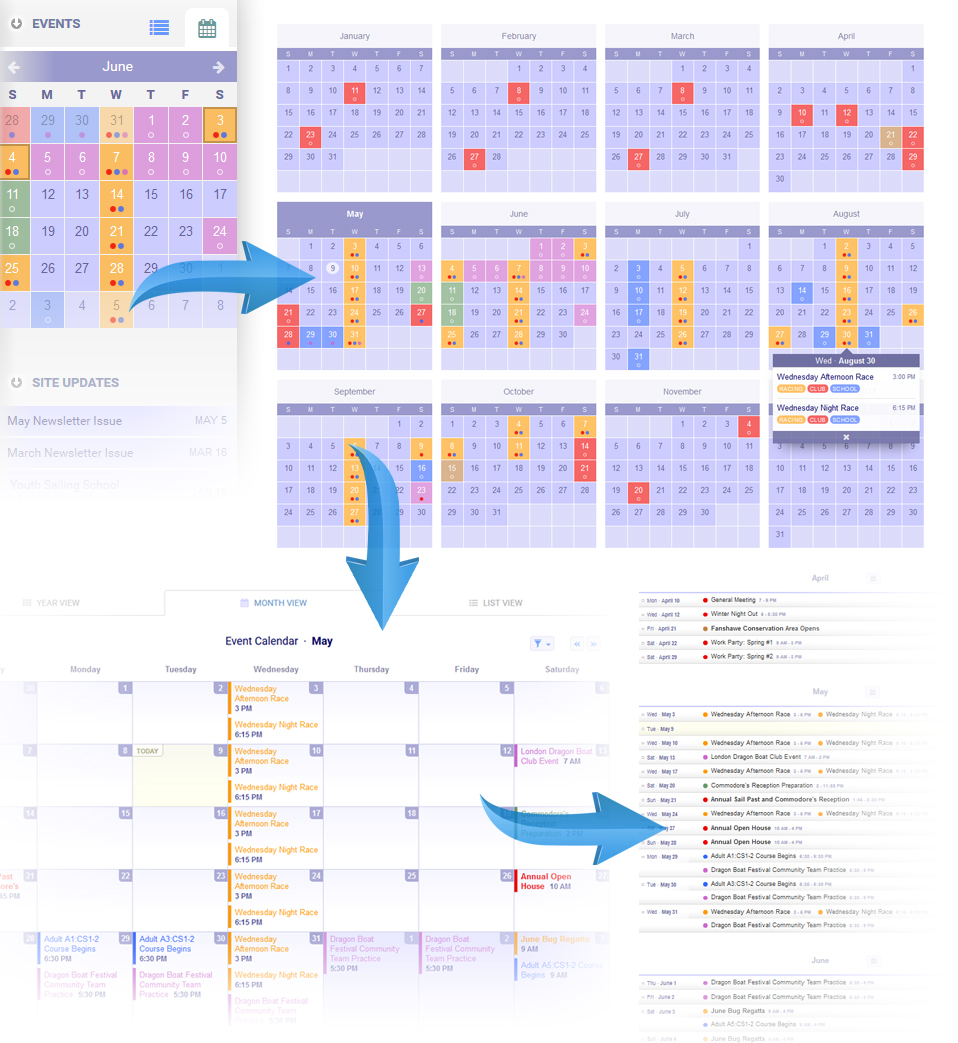 In addition to being featured on club's Facebook page, events on the website can be accessed via three different views: an entire year calendar, a single month calendar, or in a list. All calendar views automatically mirror any updates and changes while maintaining a consistent colour coding for the categories of events.